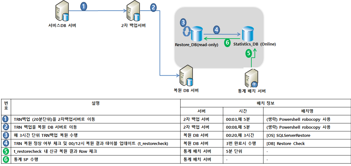 | (생략) Powershell robocopy 사용 | - | TRN 백업 이동(2차백업서버 → 복원 DB 서버) |