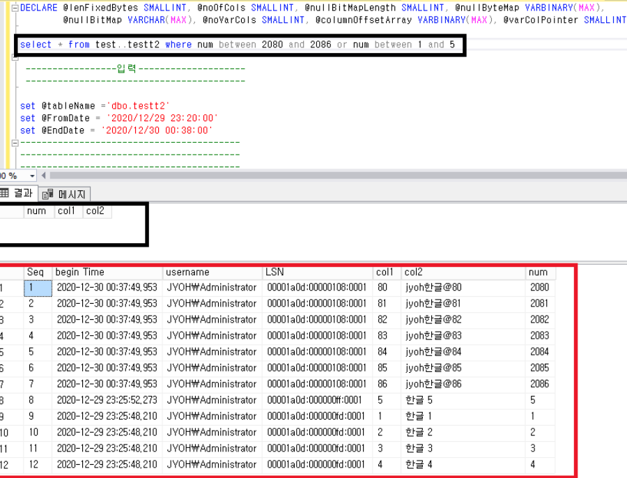 select * from test..testt2 where num between 2080 and 2086 or num between 1 and 5