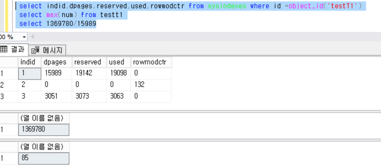 select 1369780/15989 -- Row Cnt/Page Cnt = Page당 평균 Row 수 = 85