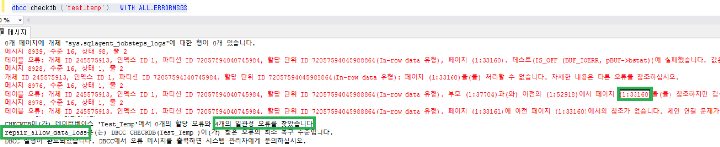 /*CHECKDB이(가) 테이블 'testT1'(개체 ID 245575913)에서 0개의 할당 오류와 4개의 일관성 오류를 찾았습니다.