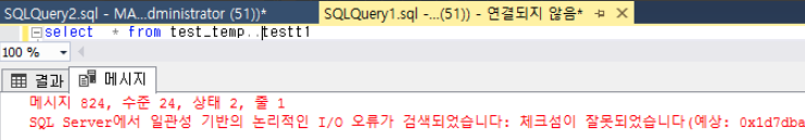 파일 'C:\test\test2.mdf'의 오프셋 0x00000010310000에서 데이터베이스 ID 10에 있는 페이지 (1:552)의 읽기 중 이 오류가 발생했습니다.