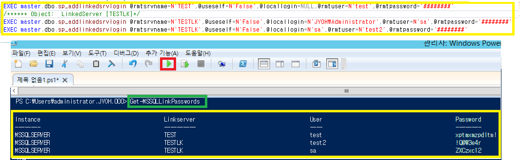 PowerShell 내 스크립트 복붙 > 실행 > Func 'Get-MSSQLLinkPasswords' 입력