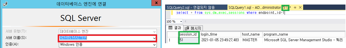 우측 쿼리창 내 쿼리를 실행하여 현재 쿼리창 SID와 DAC 접근 SID 동일 확인 가능